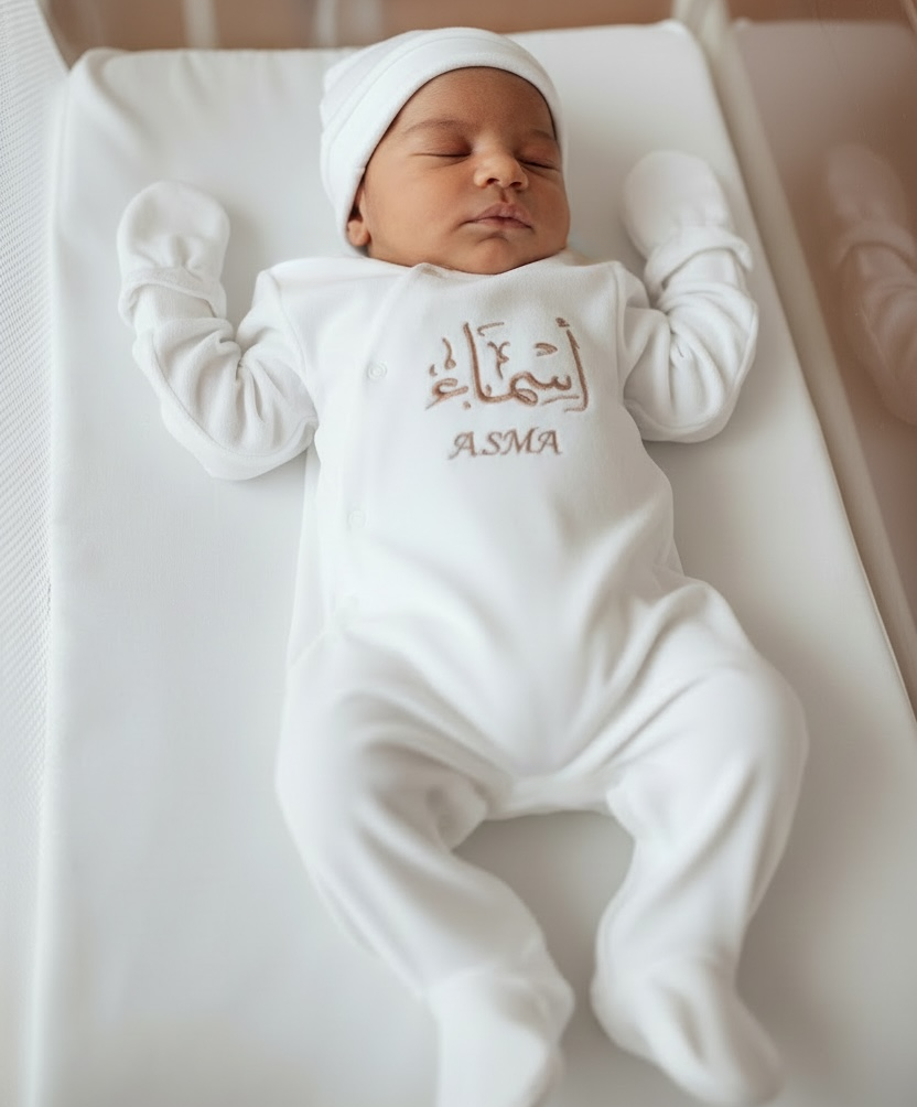 Chez nous, la personnalisation n'a pas de de frontière : nous brodons des prénoms en français, en arabe ou bien les deux ensemble.
